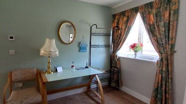 Single profiling bed, linen provided. Bright airy room with plenty of drawer storage and hanging space. Wall mounted TV and dressing table